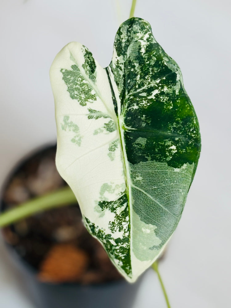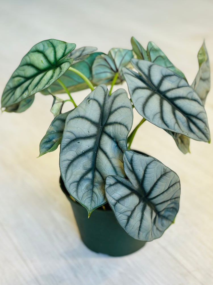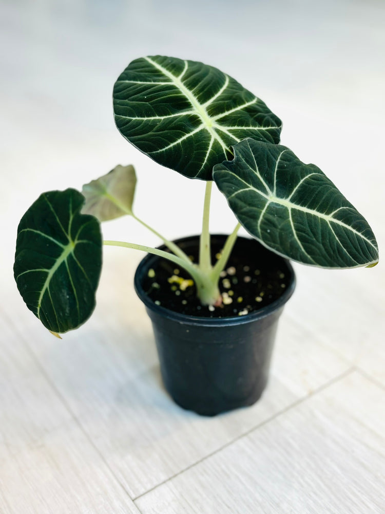 Examples: Alocasia reginula 'Black Velvet', Alocasia baginda 'Silver Dragon'