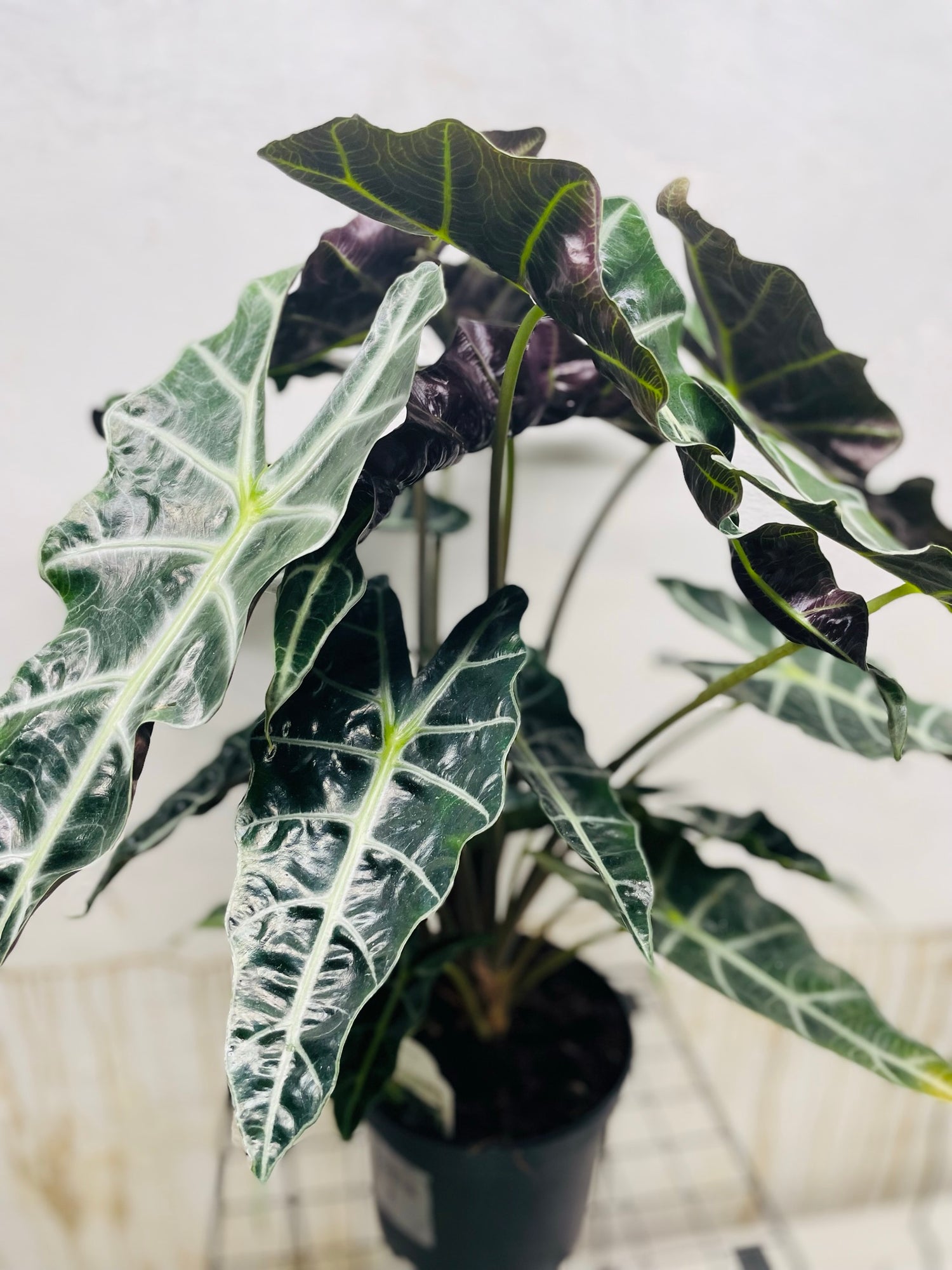 Alocasias are tropical perennial plants native to Asia and Eastern Australia, highly prized for their striking, often arrow- or shield-shaped foliage. Their leaves are known for intricate veining and dramatic textures, with some varieties featuring metallic sheens or dark purple undersides. While they can produce a simple, calla lily-like flower (spathe and spadix), they are almost exclusively grown for their dramatic foliage and rarely flower when kept as houseplants. Popular cultivated varieties include Alocasia amazonica 'Polly', Alocasia reginula 'Black Velvet', and Alocasia zebrina.