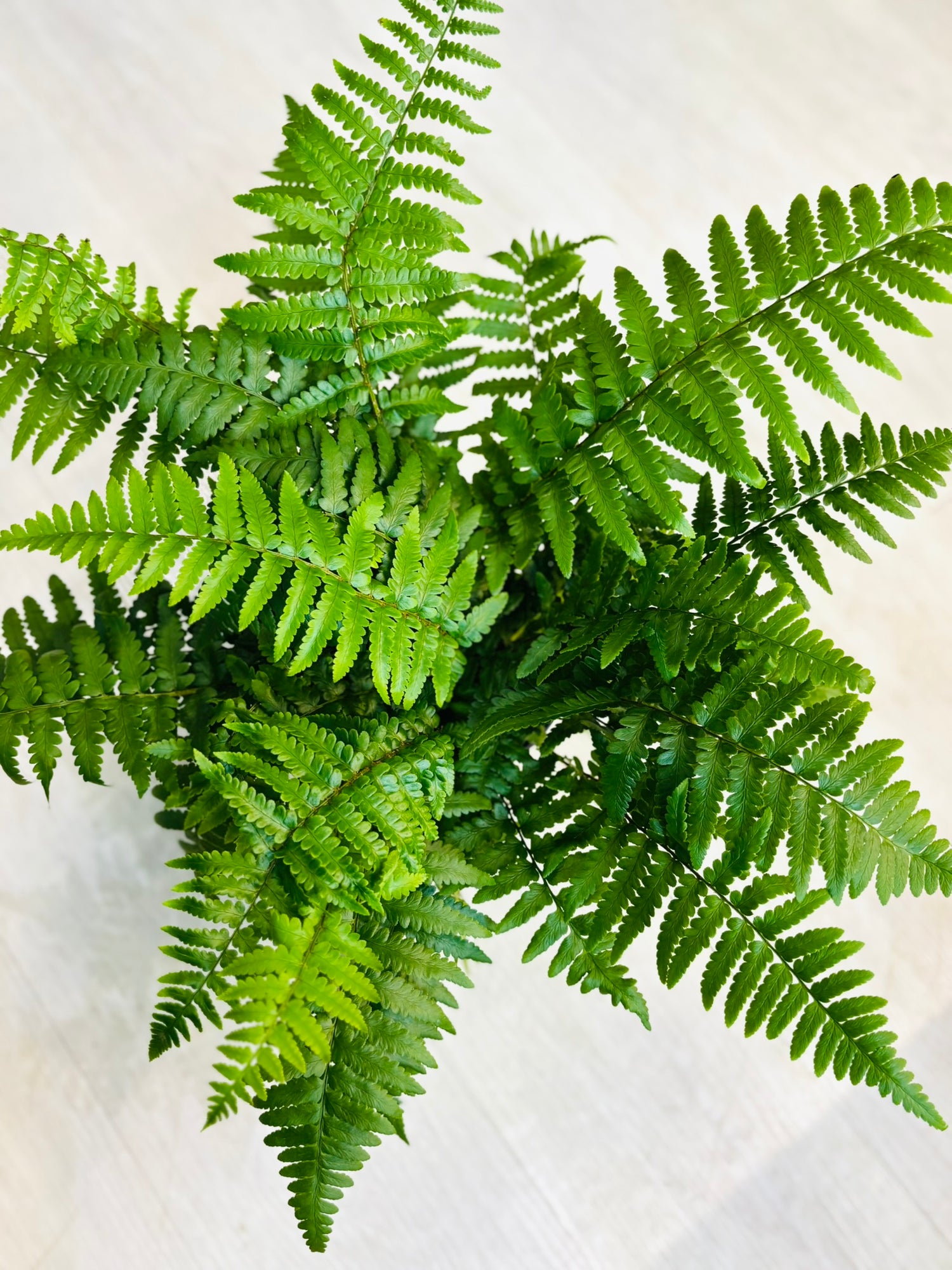 Ferns are an ancient group of non-flowering vascular plants native to diverse habitats, predominantly tropical forests, where they often grow on the forest floor or as epiphytes. They are characterized by their feathery, finely divided leaves called fronds and reproduce via spores. They are highly popular houseplants for their lush, green texture and ability to tolerate lower light. Since "Ferns" is a vast group, care is generalized. Popular cultivated types include the Boston Fern, Maidenhair Fern, and Bird's Nest Fern.