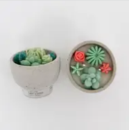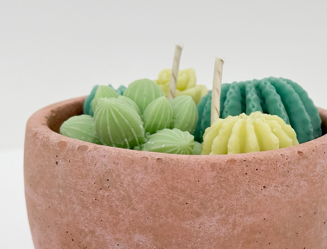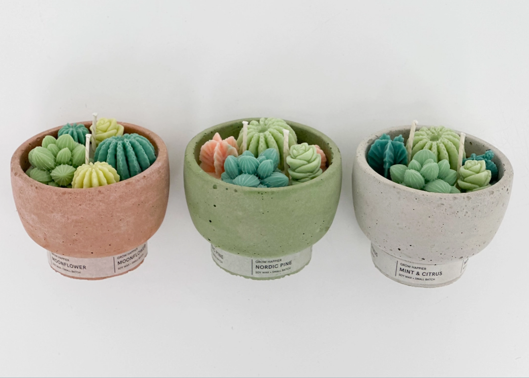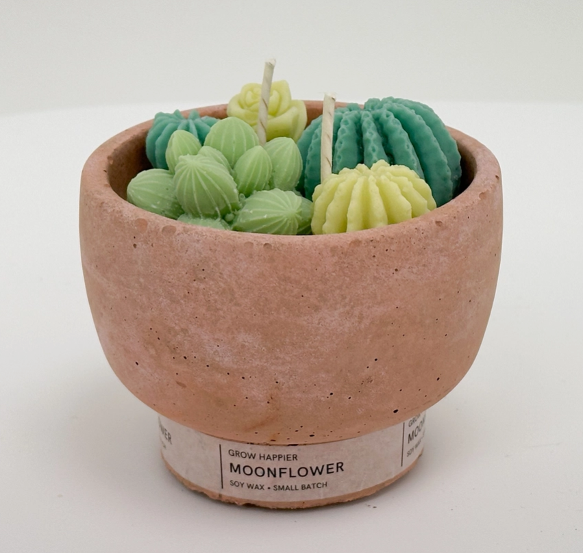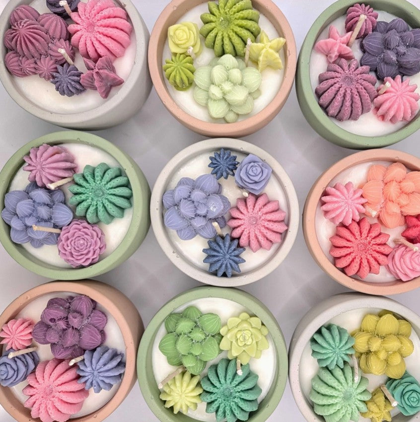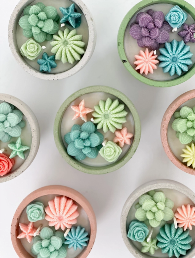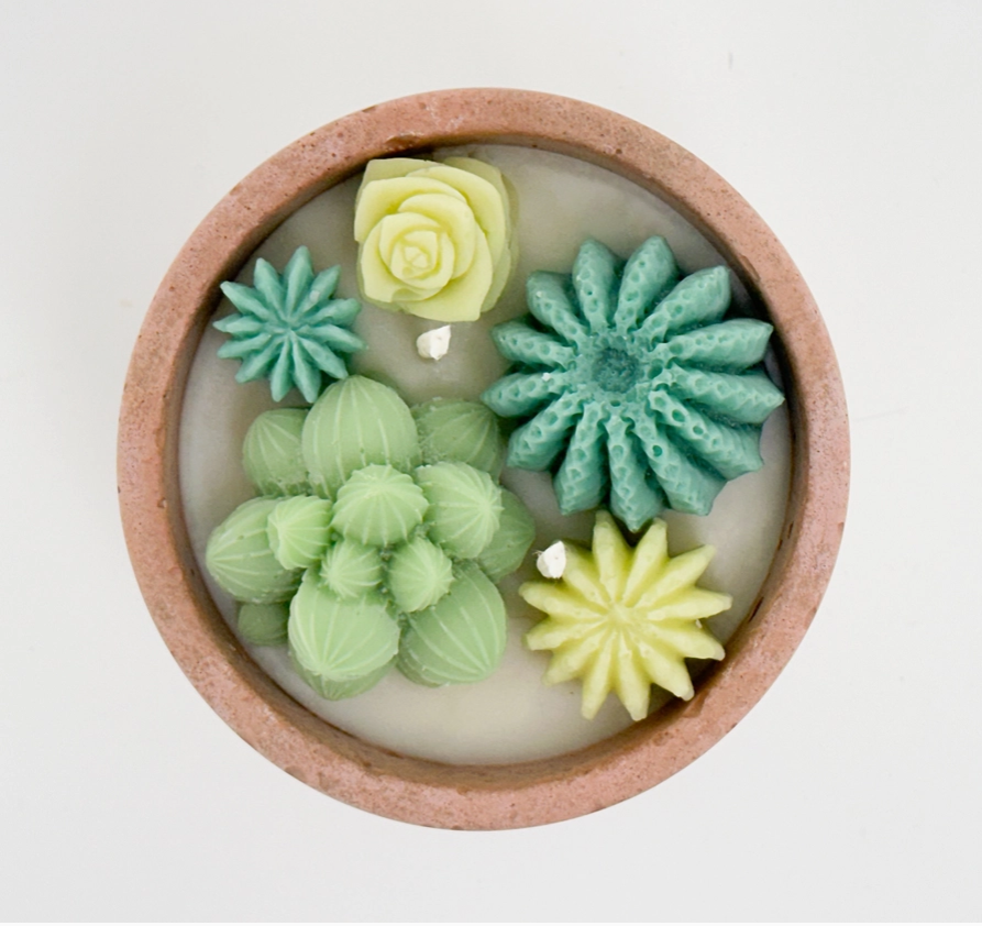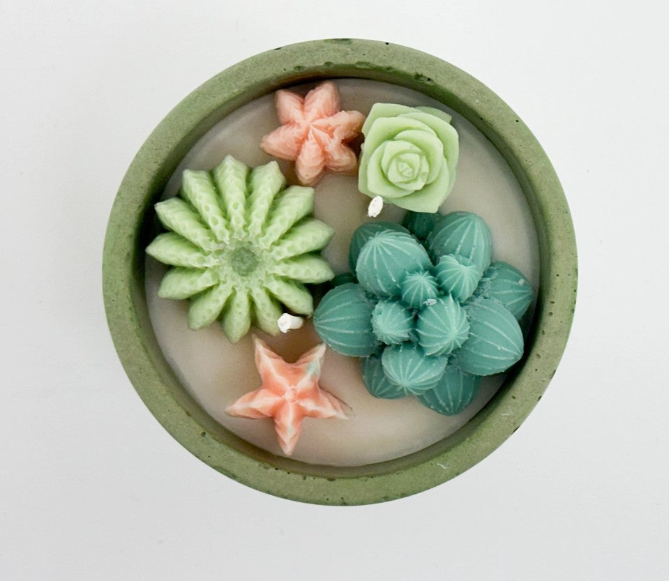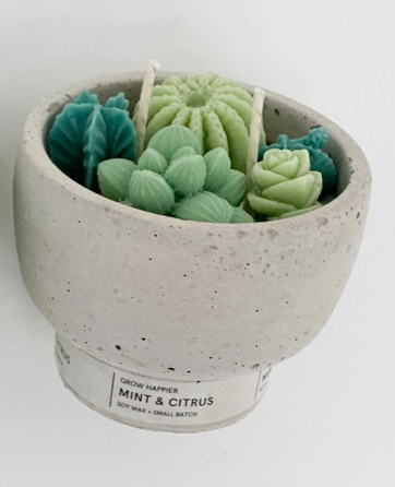 Made with soy wax in a handcrafted concrete vessels. Candles are topped with scented, wax succulents that melt beautifully as the candle burns. Concrete vessel colors vary for each scent.