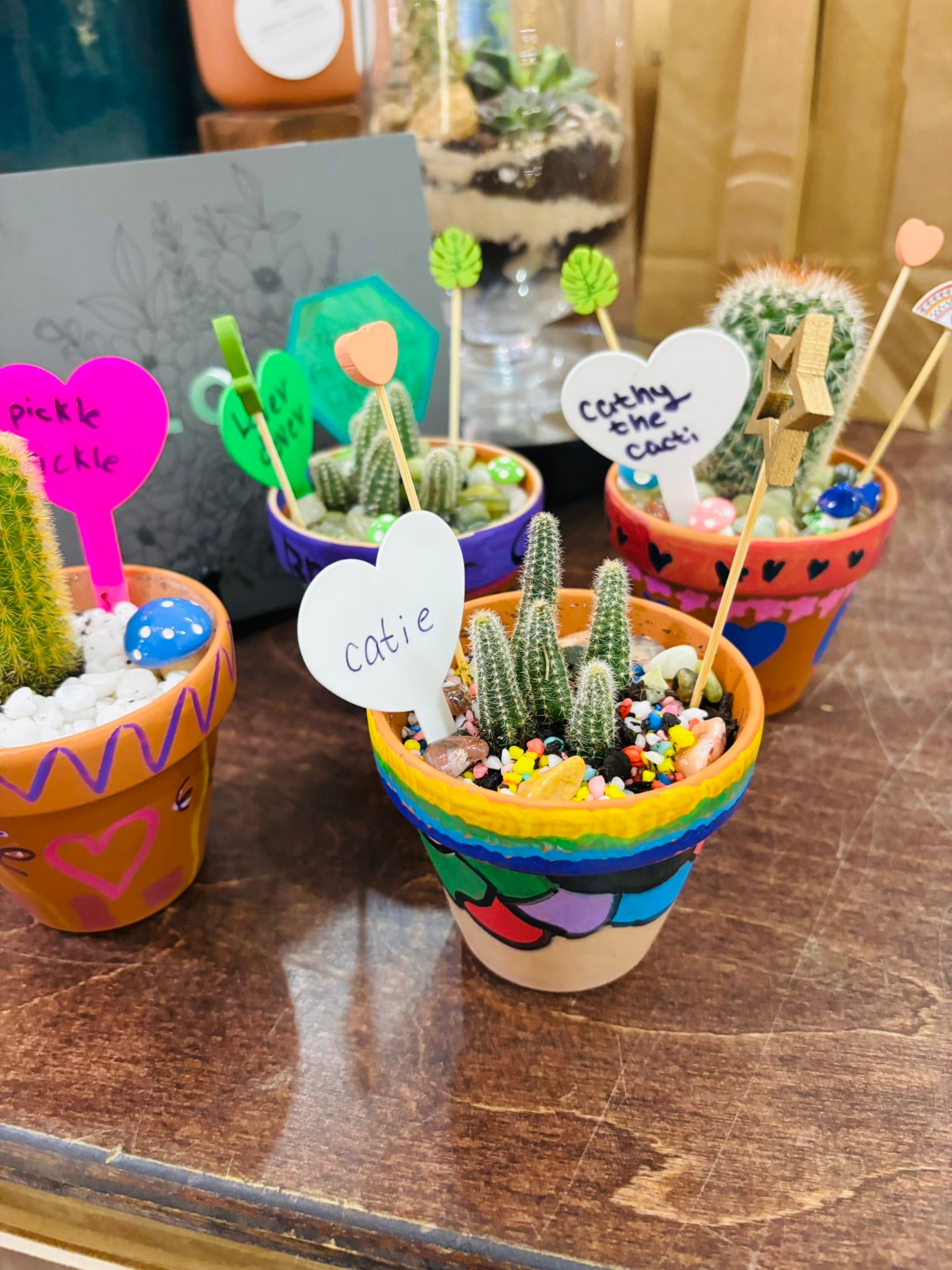 - Potting Bar Experience - choose from an array of decorative pebbles, plant picks, and little accents to bring their plant friend to life!