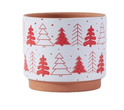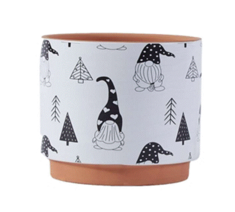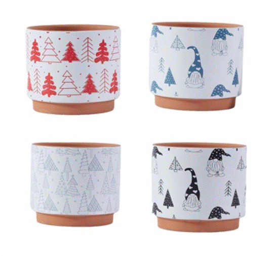 Festive ceramic planters featuring gnome and Christmas tree designs—perfect for holiday decor and plant displays.